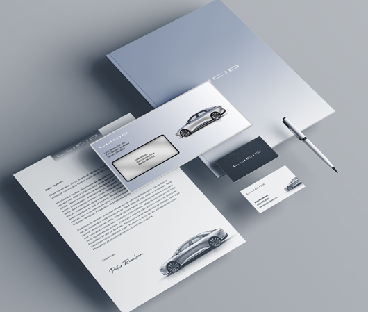 Lucid Motors is an electric vehicle manufacturer. I designed a letterhead, envelope, folder and business card to promote their new car, the Lucid Air.